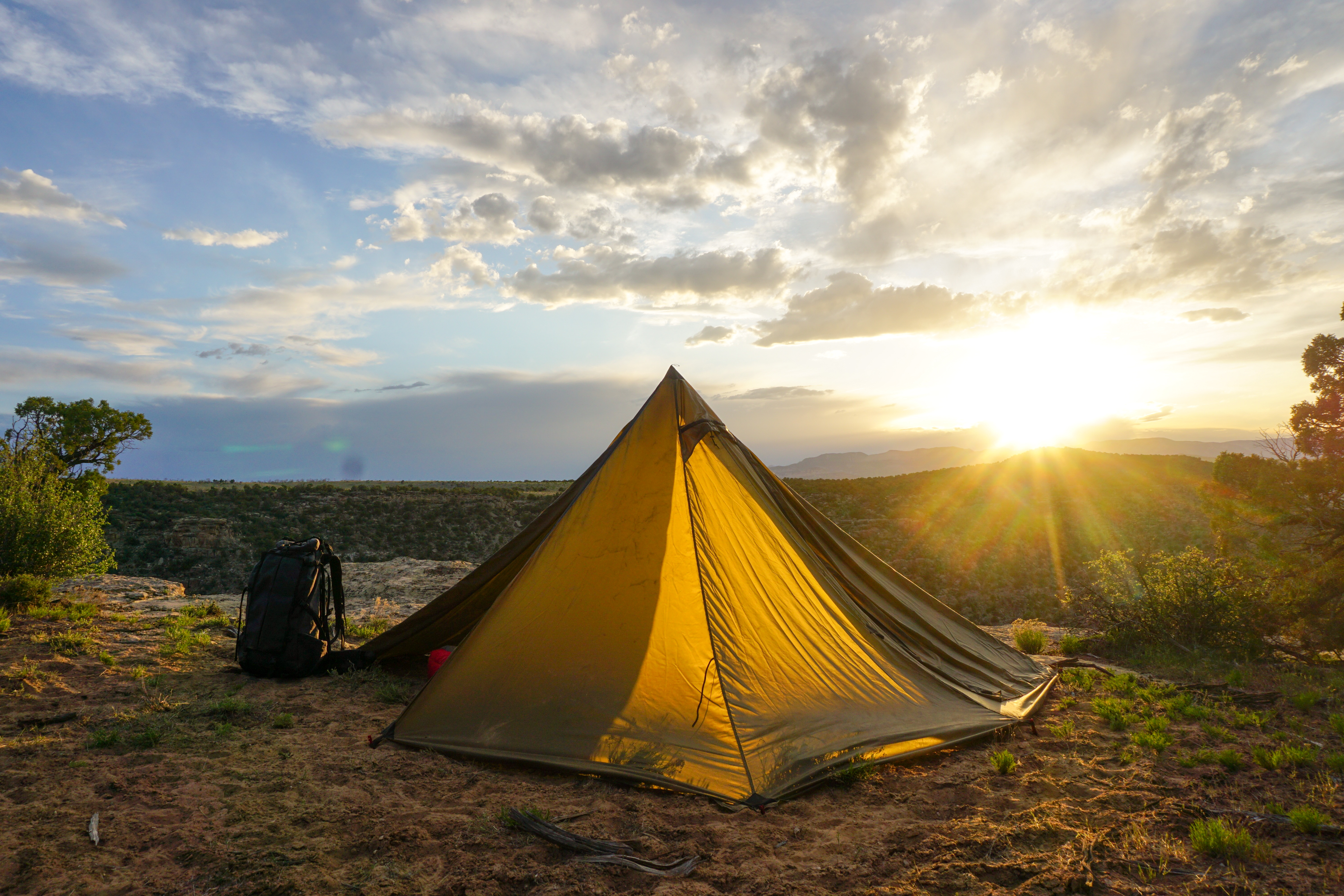First, the Cimarron tent is unique in its design. Unlike our traditional tipi tents, this tent is a pyramid/tipi hybrid with a rectangular shape at the base instead of being totally round. This does a few important things. First, the rectangle design and subtle angles create more usable space space, making this a very comfortable feeling tent. The subtle angles also reduce flat-sided wind loading. Next, the pyramid style design makes it very easy and quick to set up.