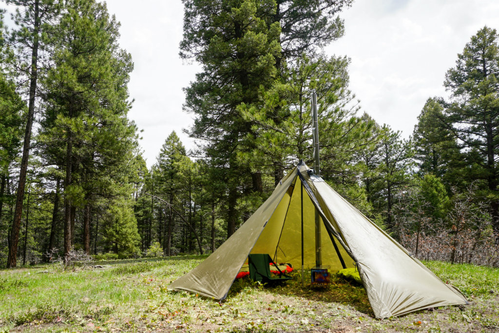 The Cimarron has two entrances and a max height of about six feet, making it a very functional and liveable shelter. It's easy to get in and out of the tent with multiple people. At 94 square feet, the Cimarron provides a very comfortable living space. This tent can sleep four without a stove, or two to three people with a stove, depending on the amount of gear.