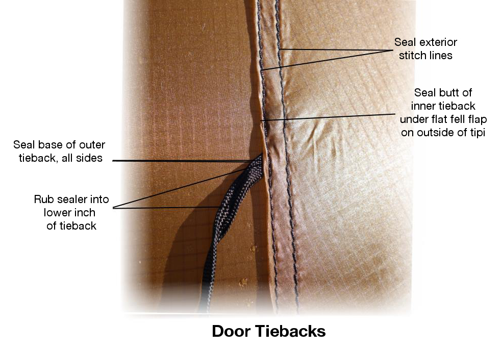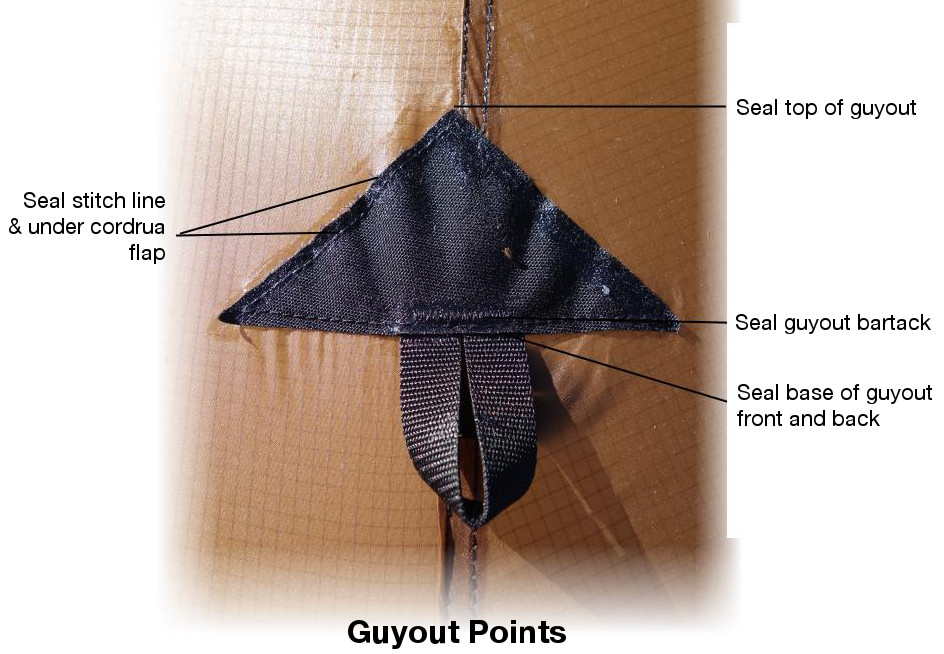 We recommend sealing the exterior seams (the double lines of stitching), but it is more important to do a good job of sealing door tiebacks, hang loops, and guyout points.