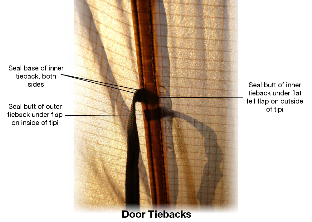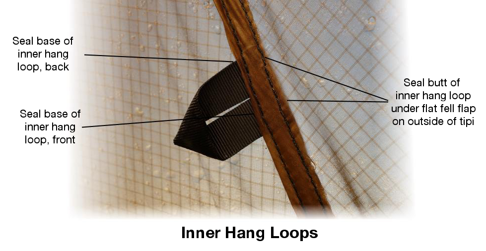 4. Inner Hang Loops: Seal the butt of the inner hang loops under the flat fell flap on the outside of the tipi, then seal all sides of the base on the inside of the tipi.