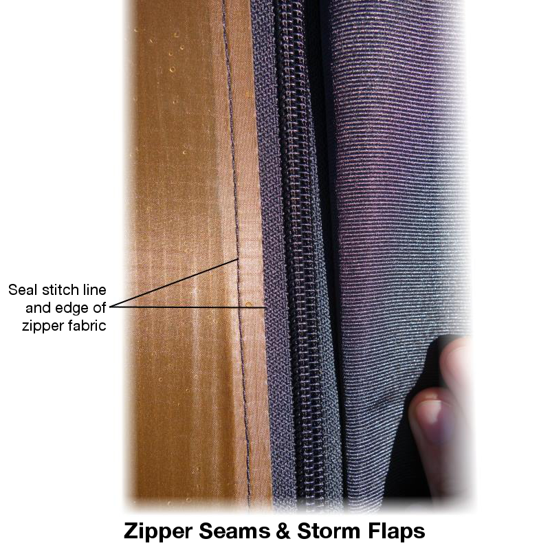 8. Zippers: If you plan on high occupancy and people will be sleeping under the zippers then seal them inside and out. Extremely wet weather and heavy rain can soak into the zipper material itself.