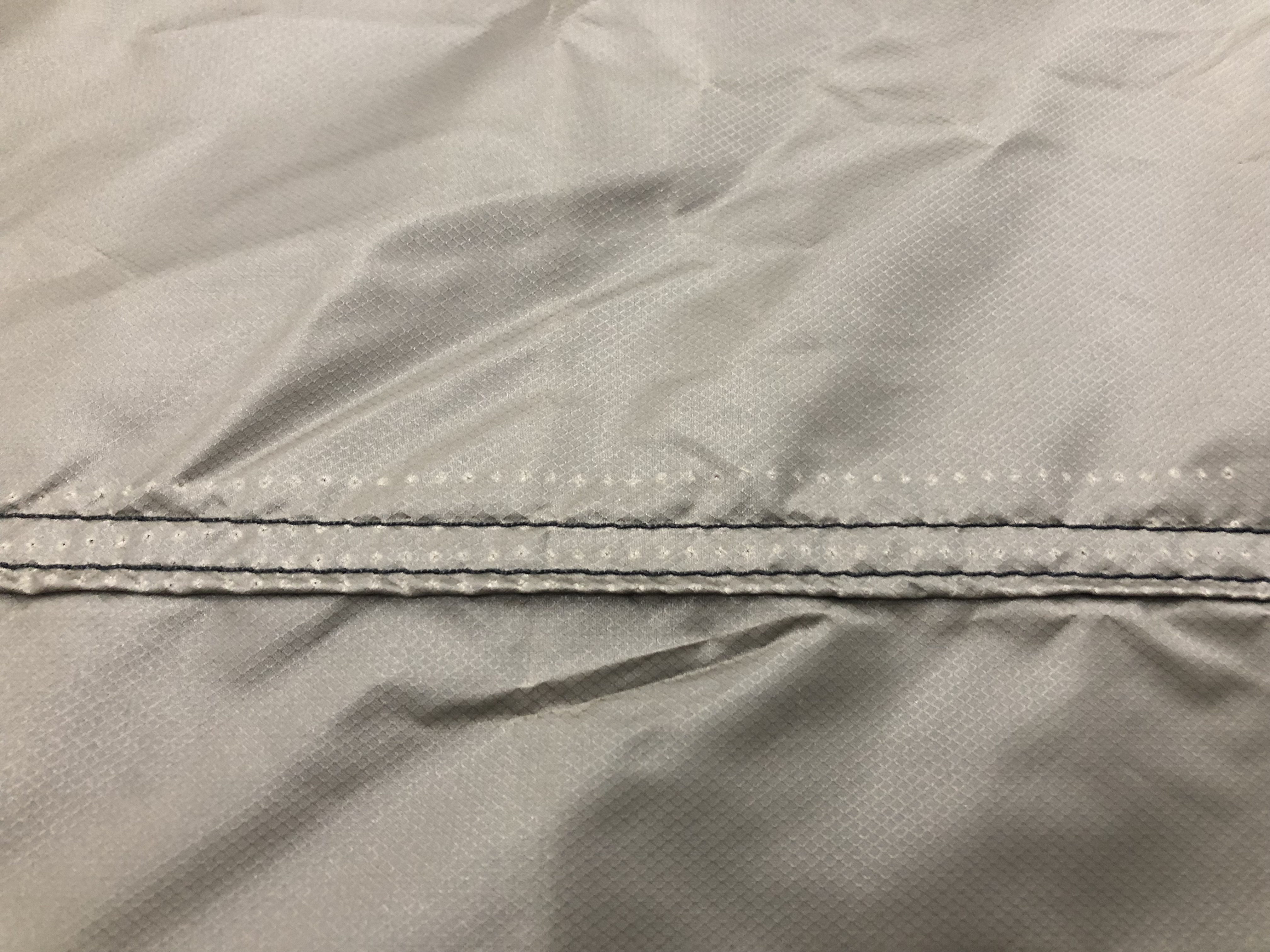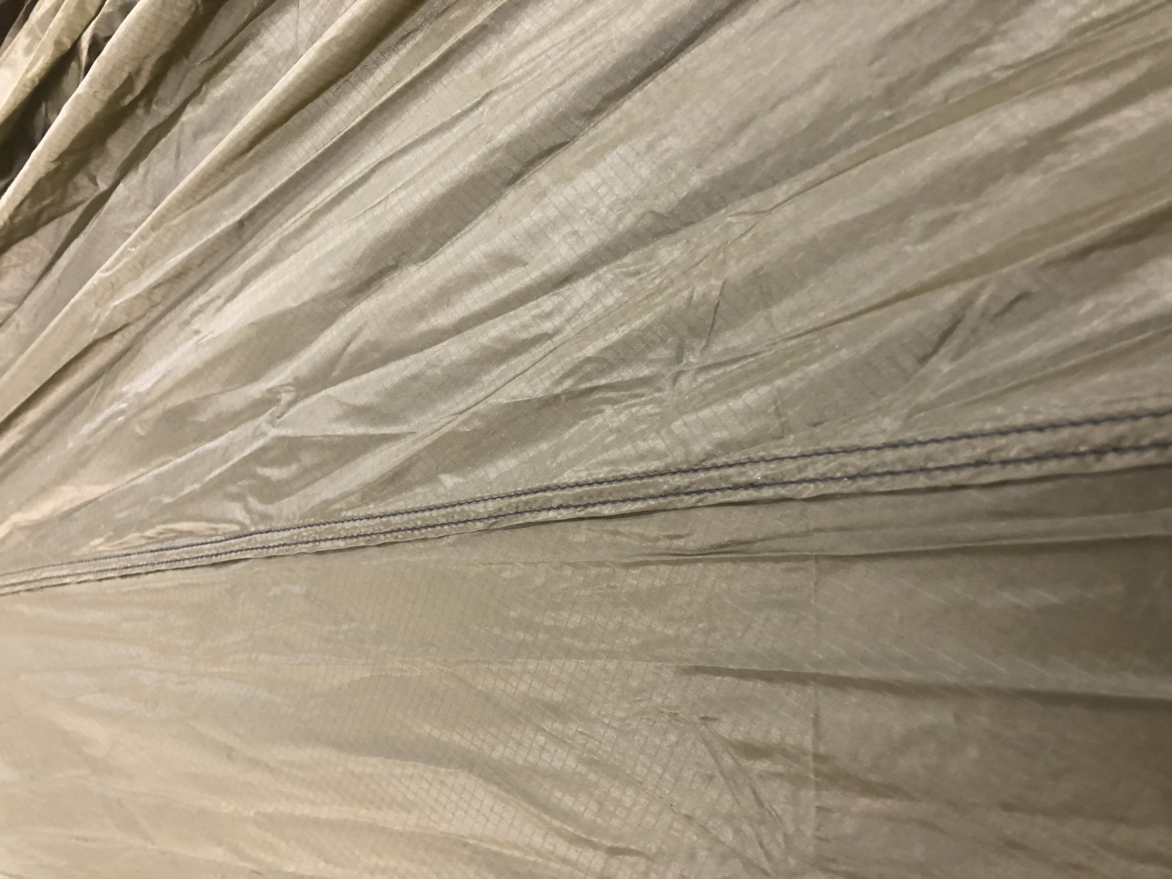 4.) When we are training a new Flat Felled sewer it can take time to get the feel for the machine. During the training process sometimes a seam that should be straight ends up being a little wavy. Wavy seams don't affect the integrity of a shelter at all, but may cause a panel to look less taut than the others. Sometimes the wavy stitch is really hard to see, but our inspectors are really great at finding it! (I can't even see it in this picture, but they assure me it's there)